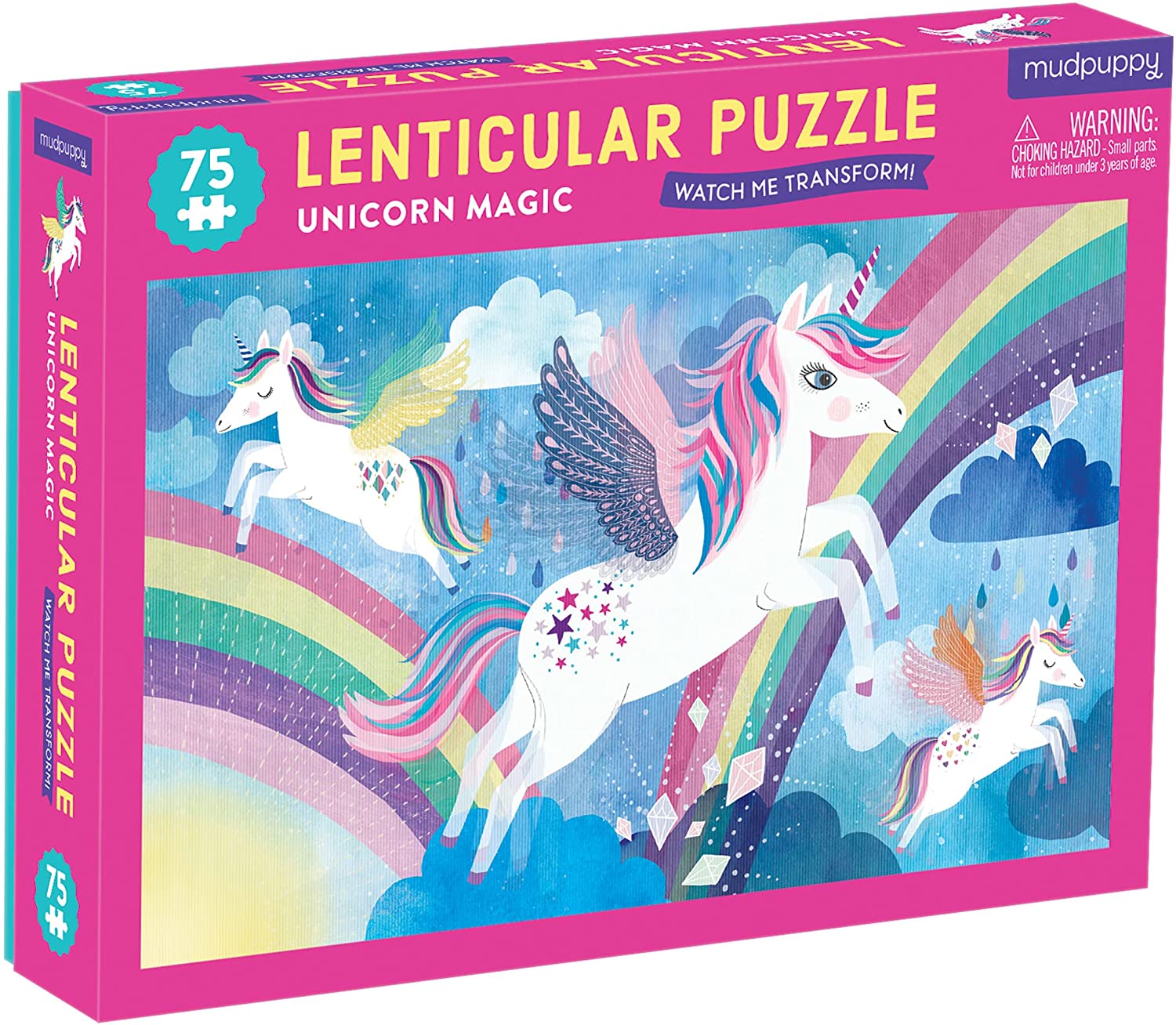 El rompecabezas lenticular Unicornio Mágico de 75 piezas de Mudpuppy es un formato de rompecabezas emocionante e innovador que, cuando se arma, tiene una imagen maravillosa que se transforma y se mueve ante tus ojos. ¡Mira unicornios mágicos volar por el cielo!
