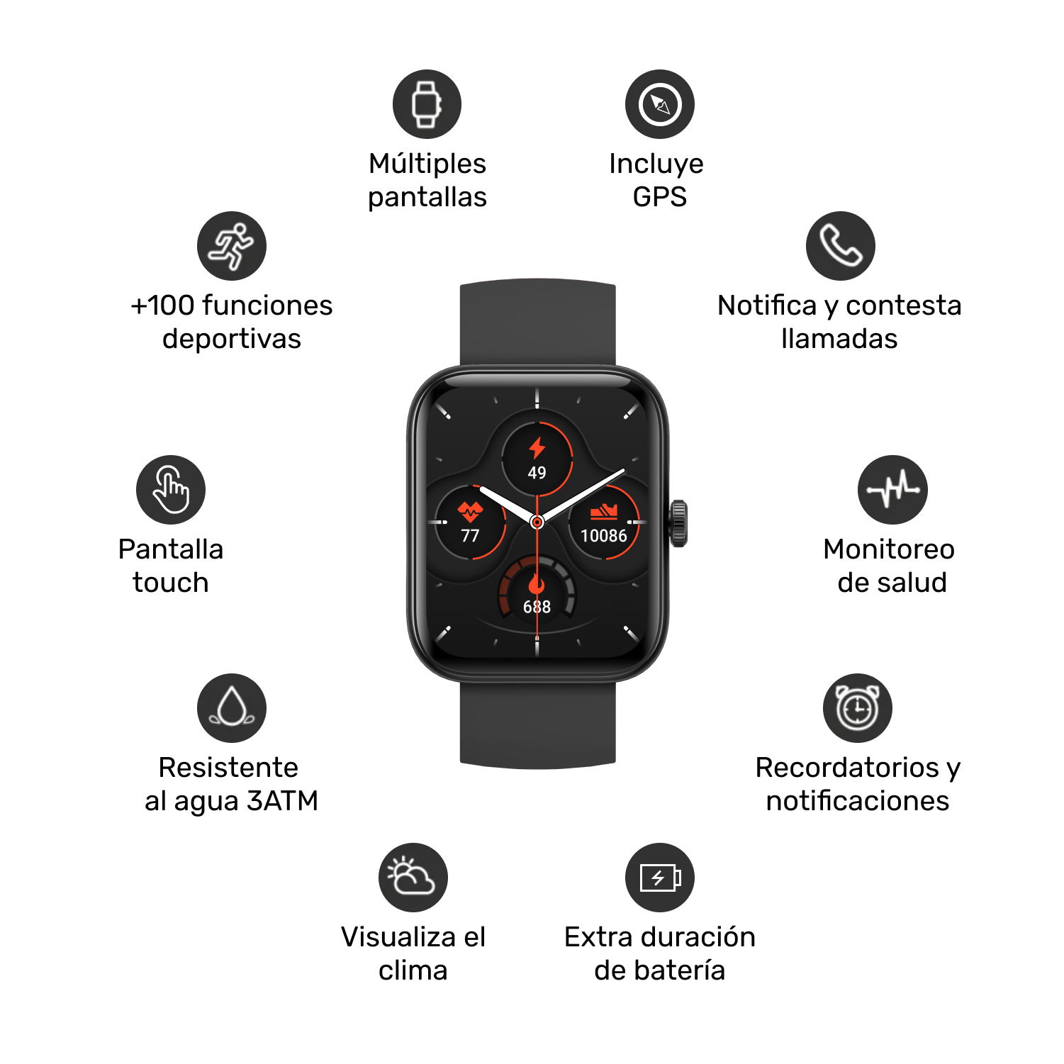 Con GPS integrado y conexión Bluetooth, permite hacer llamadas desde el reloj y recibir notificaciones de mensajes, redes sociales y clima. Además, es compatible con iOS y Android, y controla tu música directamente desde la muñeca.