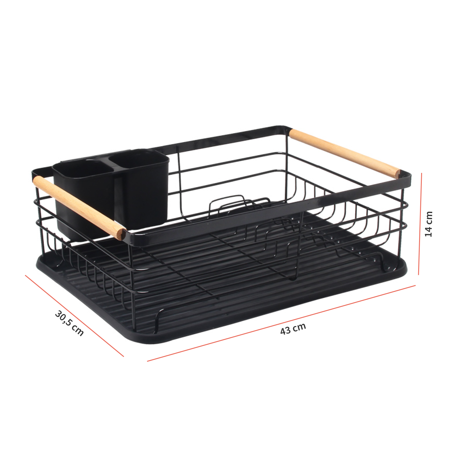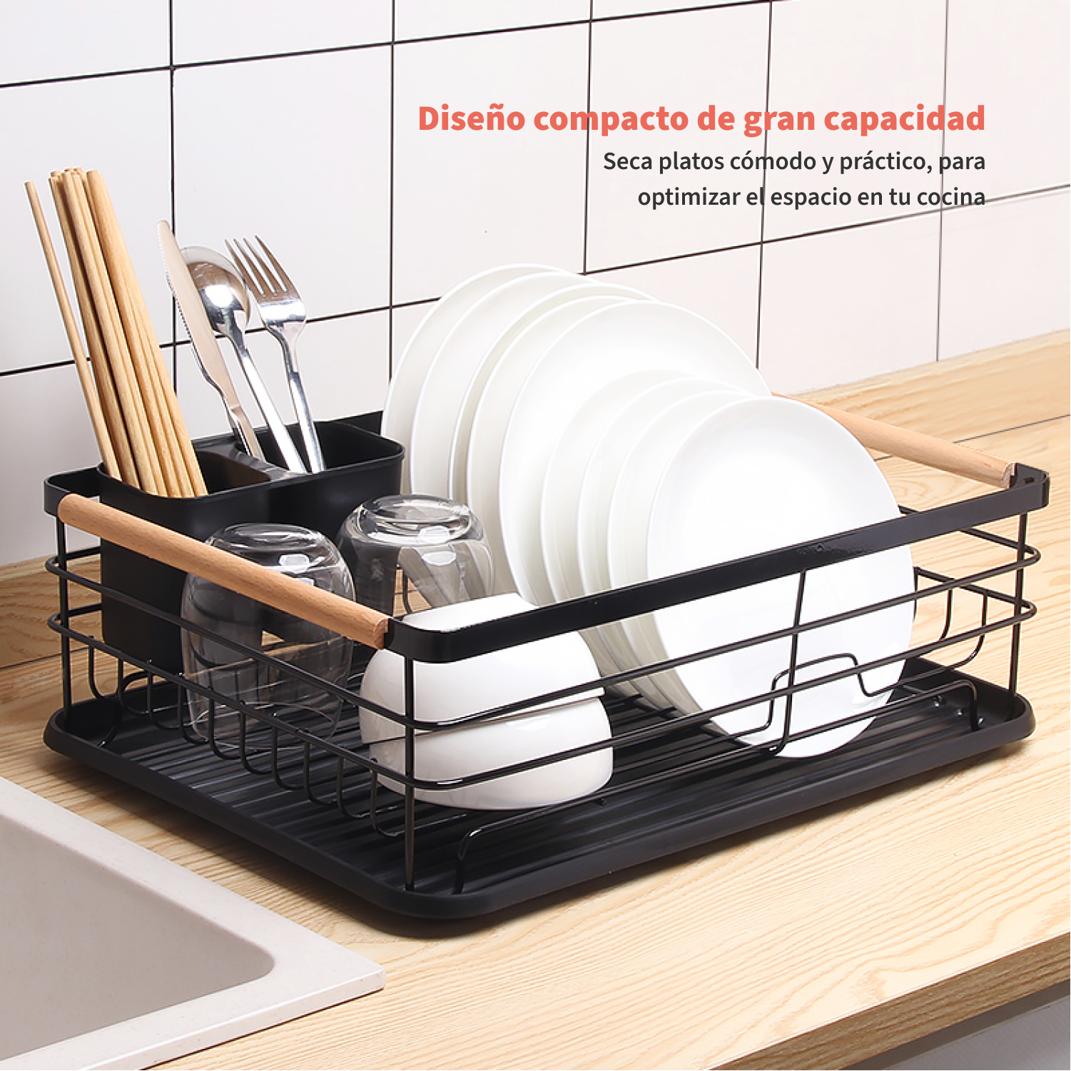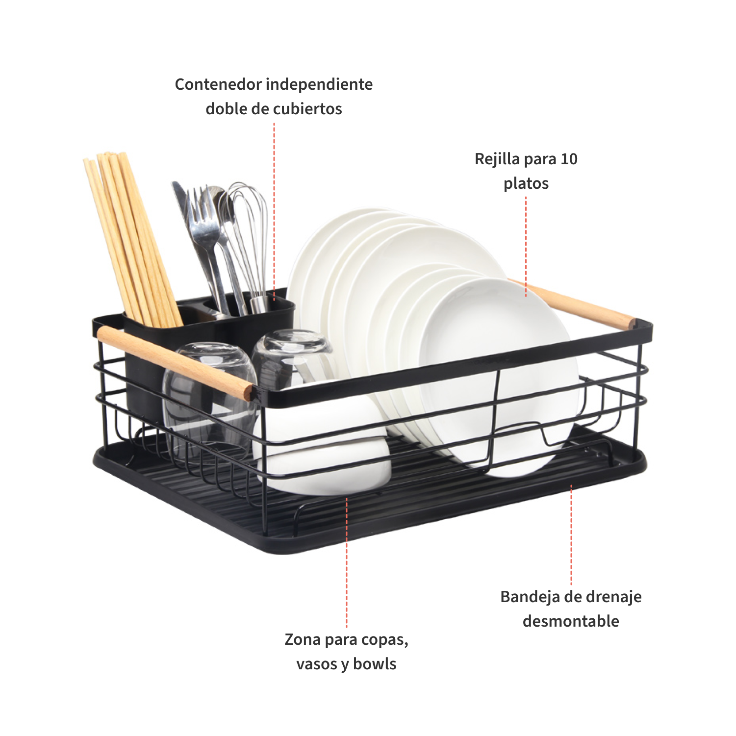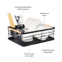 Cuenta con una bandeja inferior de drenaje y un contenedor doble para separar tus cubiertos.