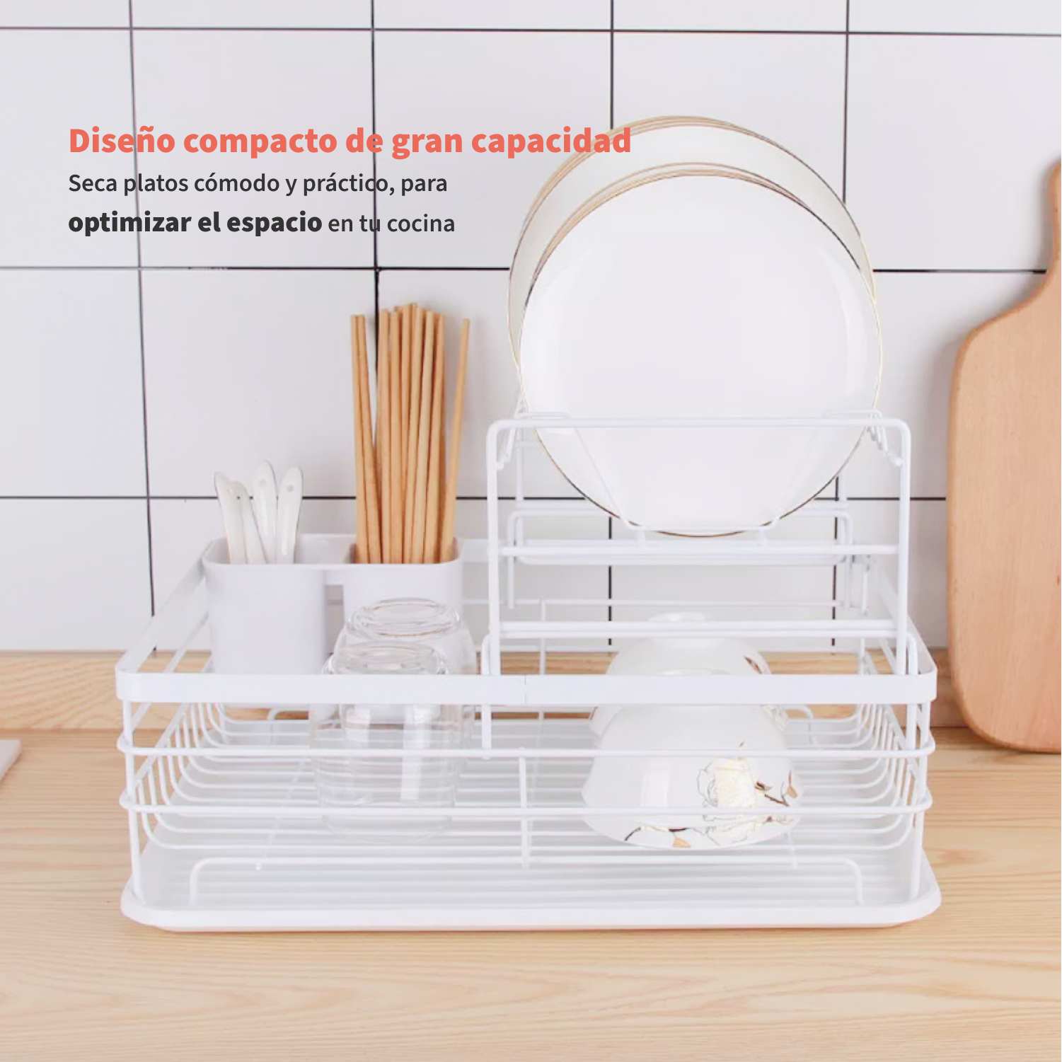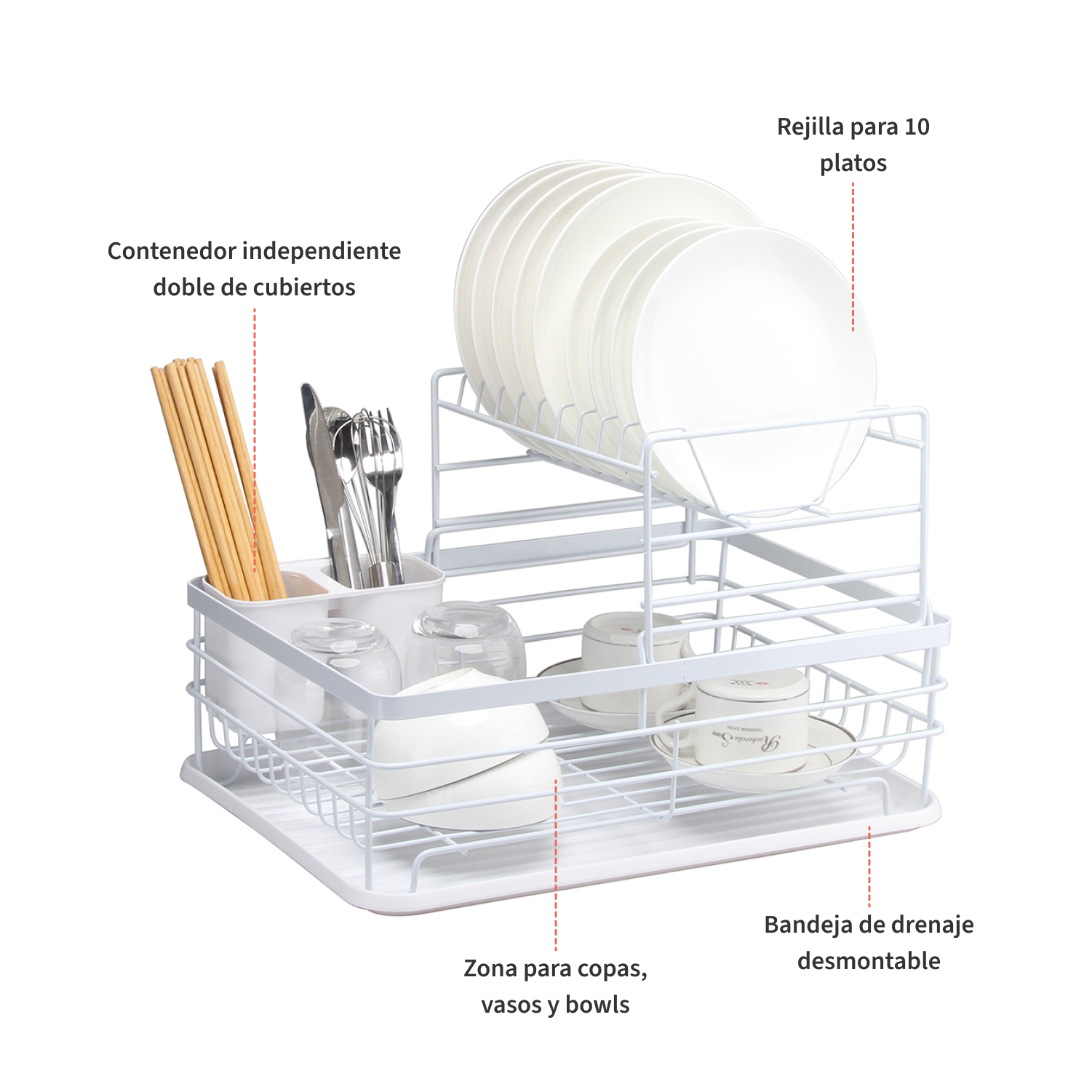 Con nuestro Secaplatos el espacio en tu cocina ya no es un problema. Es compacto, pero de gran capacidad, te permite ordenar 10 platos en la parte superior más vasos y lo que quieras en la parte inferior.