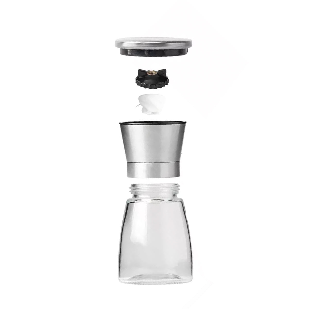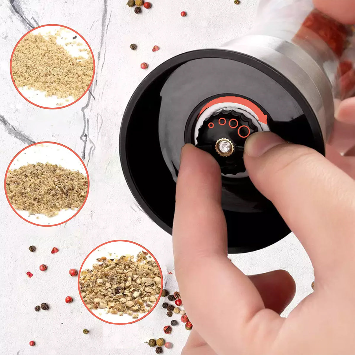 La perilla de plástico en la parte superior se puede regular para elegir el nivel de grosor de la sal molida que prefieras.