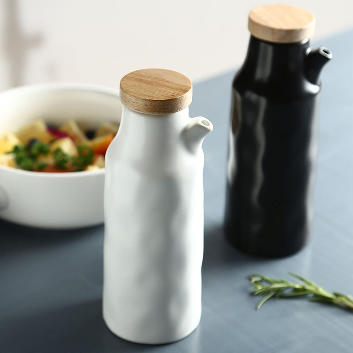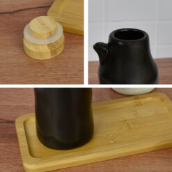 Moderno set de alcuza de 2 piezas con tapa de madera. Diseño simple y minimalista para acompañar tus comidas.