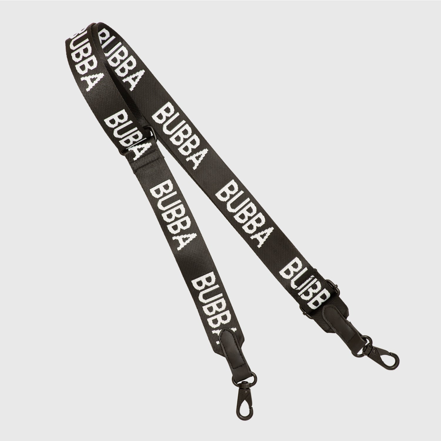 ¡Combina e intercambia tus sleeves, carteras y bolsos con nuestra BUBBA STRAP! Esta correa negra, adornada con letras blancas en poliéster y detalles de cuero vegano, es la opción perfecta para mantener tu estilo siempre cool.