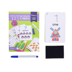El juego de tarjetas cognitivas contiene 26 tarjetas reutilizables donde puedes escribir, un marcador lavable y un paño para limpiar. Es una manera perfecta y divertida de ayudar a los niños a aprender los números y asociación numero cantidad.