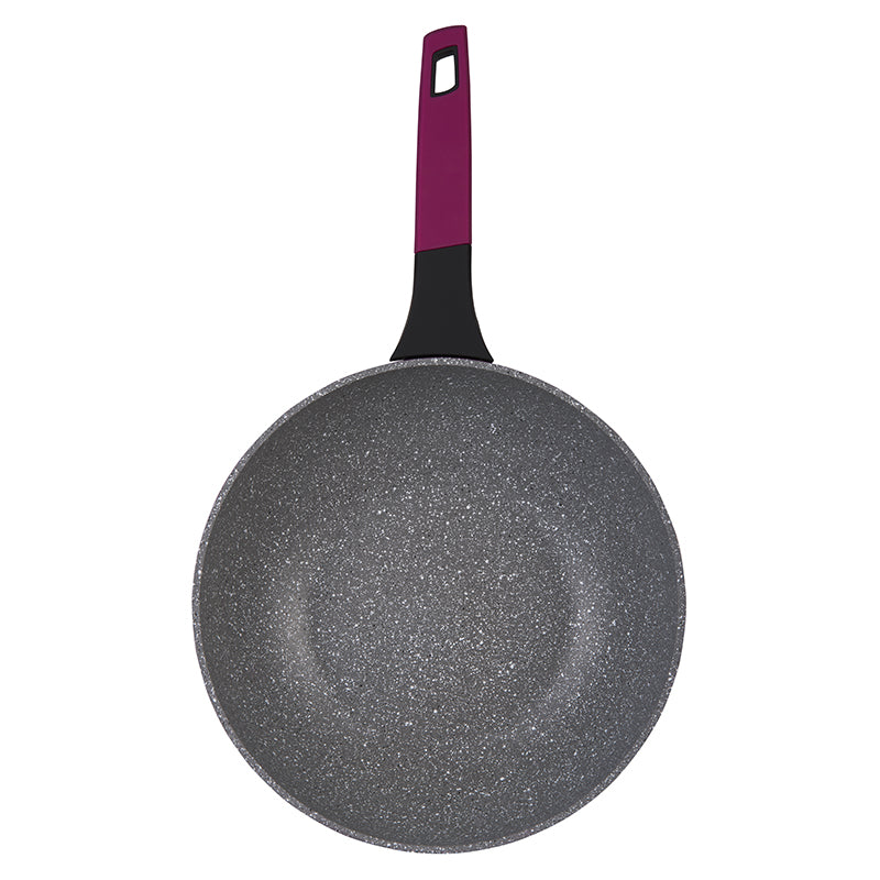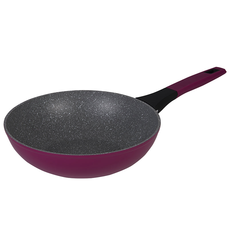 Wok Soho de 28cm Cherry, con cuerpo de Aluminio Forjado de la más alta durabilidad, conduce mejor el calor y permite un ahorro de energía. Interior Antiadherente Marble de doble capa de última generación más resistente a elementos abrasivos, corrosión y menor rayado.
